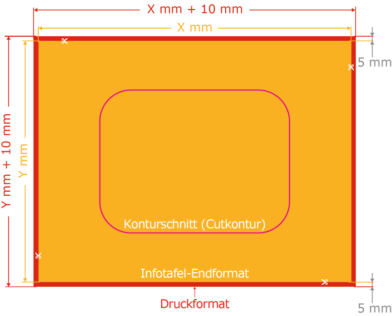 Auf Grund von Toleranzen beim Schneiden ist die Druckdatei allseitig 5 mm größer anzulegen als das gewünschte Infotafel-Endformat (X x Y mm) sein soll.